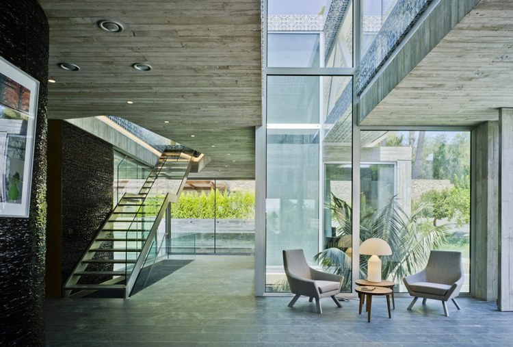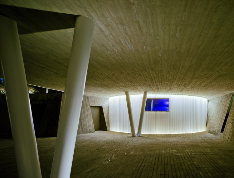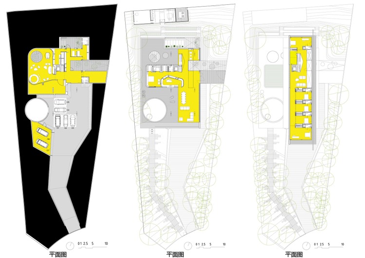 1.舒適性體驗 地下室內(nèi)部映照著一定的自然光可以滿足休閑娛樂所用。趣味從停車庫開始,透過這里的后擋風(fēng)玻璃窗設(shè)計可以看見游泳池;由彩色模壓混凝土鋪筑成的人行道加強了房間與室外區(qū)域的聯(lián)系; 2.居住性體驗 一層包括一個C形區(qū)域并向私人開放向空間敞開。巨大的懸臂頂棚將內(nèi)外區(qū)域連接起來,家人可以在這里聽音樂、看展覽。