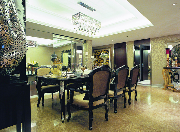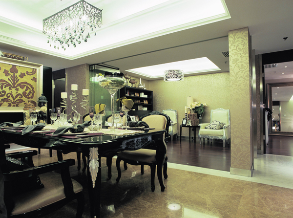 在設(shè)計(jì)上,墻面大面積的使用了古典歐式色彩的壁紙配合經(jīng)過(guò)提煉的歐式線條,使歐式不再是遙遠(yuǎn)的過(guò)去,而是鮮活時(shí)尚的品味象征。減掉了復(fù)雜的歐式護(hù)墻板使用了提煉過(guò)的石膏線勾勒出線框,把護(hù)墻板的形式簡(jiǎn)化到極致。